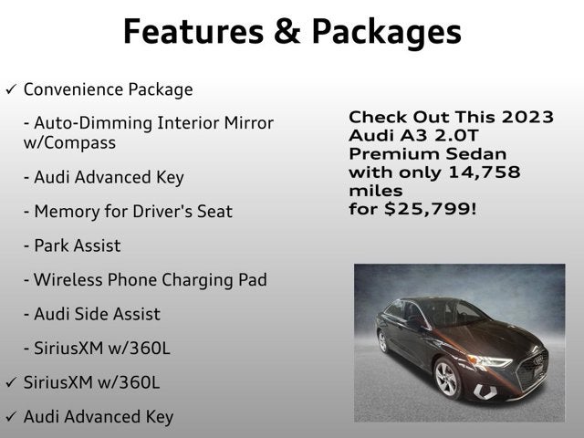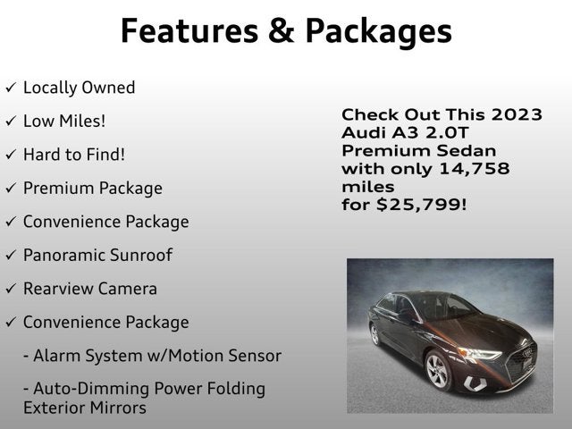 Locally Owned, Low Miles!, Hard to Find!, Premium Package, Convenience Package, Panoramic Sunroof, Rearview Camera, A3 40 Premium FrontTrak, 4D Sedan, 2.0L 4-Cylinder TFSI, 7-Speed Automatic S tronic, FrontTrak, Mythos Black Metallic, Black Leather, Alarm System w/Motion Sensor, Audi Advanced Key, Audi Side Assist, Auto-Dimming Interior Mirror w/Compass, Auto-Dimming Power Folding Exterior Mirrors, Convenience Package, Memory for Driver's Seat, Park Assist, SiriusXM w/360L, Wireless Phone Charging Pad. Certified.