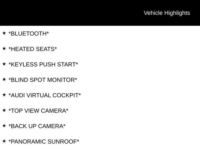 *NAVIGATION*, *PREMIUM PLUS PKG*, *S-LINE*, *QUATTRO*, *AWD*, *AUDI SIDE ASSIST*, *AUDI ADVANCED KEY*, *AUDI CONNECT*, *ACTIVE LANE ASSIST*, *BLACK OPTIC PKG*, *CONVENIENCE PKG*, *ADAPTIVE CRUISE CONTROL*, *AUX*, *USB*, *SATELLITE RADIO*, *SMART PHONE INTERFACE*, *Bluetooth®*, *HEATED SEATS*, *KEYLESS PUSH START*, *BLIND SPOT MONITOR*, *AUDI VIRTUAL COCKPIT*, *TOP VIEW CAMERA*, *BACK UP CAMERA*, *PANORAMIC SUNROOF*, *BANG & OLUFSEN*, *LED HEADLIGHTS*, *AUDI PRE SENSE REAR*, *AUDI DRIVE SELECT*, *STEERING WHEEL CONTROLS*, AUDI BEAM RINGS, HEATED STEERING WHEEL, *HEATED STEERING WHEEL*, 2 Rear USB Charge Ports, Adaptive Cruise Control, Alarm System w/Motion Sensor, Aluminum Ellipse Dark Inlays, Audi Active Lane Assist, Audi Advanced Key, Audi Phone Box, Audi Side Assist w/Pre Sense Rear, Audi Virtual Cockpit Plus, Auto-Dimming Exterior Mirrors w/Memory, Bang & Olufsen Sound System w/3D Sound, Black Exterior Mirror Housings, Black Exterior Trim, Black Fender Badges, Black Optic Plus Package, Black Rear Lip Spoiler, Convenience Package, Dark Chrome Exhaust Tips, Driver Seat Memory, Hands-On Detection Steering Wheel, Leatherette Covered Center Console & Door Armrests, Parking System Plus (Front/Rear Acoustic Sensors), Power Folding Exterior Mirrors, Premium Plus, Red Brake Calipers, SiriusXM w/360L, Top View Camera System, Traffic Jam Assist, Wheels: 19 5-Arm-Cutter Design Bi-Color Finish. CARFAX One-Owner.