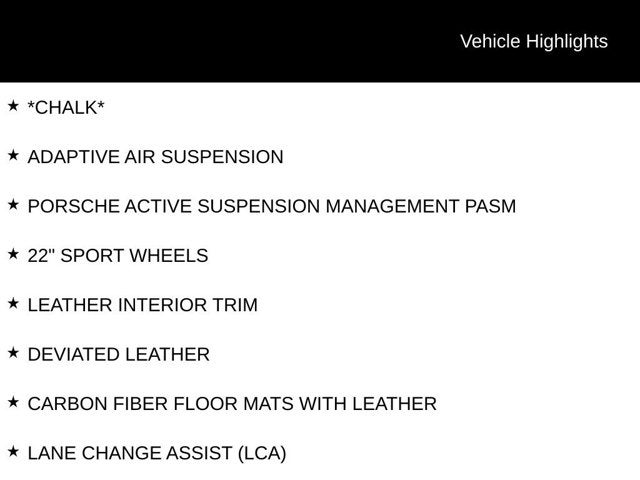 *CHALK*, ADAPTIVE AIR SUSPENSION, PORSCHE ACTIVE SUSPENSION MANAGEMENT PASM, 22 SPORT WHEELS, LEATHER INTERIOR TRIM, DEVIATED LEATHER, CARBON FIBER FLOOR MATS WITH LEATHER, LANE CHANGE ASSIST (LCA), FRONT AND REAR HEATED SEATS, VENTILATED AND COOLED FRONT SEATS, THERMALLY AND NOISE INSULATED GLASS, CENTER CONSOLE ARMREST WITH DESIGNATION, SATIN BLACK LOGO AND MODEL BADGES, LEATHER LUGGAGE COMPARTMENT COVER, SMOKING PACKAGE, CENTRAL TACHOMETER IN WHITE, REAR COMFORT SEATS (2+1), ABS brakes, Alloy wheels, Center Console Armrest w/Model Designation, Deviated Stitching Interior Package, Electronic Stability Control, Front & Rear Heated Seats, Front dual zone A/C, Front Seat Ventilation, HEATED DOOR MIRRORS, HEATED FRONT SEATS, Illuminated entry, LEATHER SEAT TRIM, Low tire pressure warning, Navigation System, Porsche Communication Management, Porsche Logo & Model Designation in Satin Black, Power Liftgate, Remote keyless entry, Smoking Package, Traction control, Wheels: 22 Cayenne Sport Classic in Gloss Black. CARFAX One-Owner.