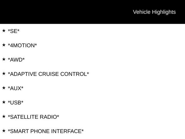 *SE*, *4MOTION*, *AWD*, *ADAPTIVE CRUISE CONTROL*, *AUX*, *USB*, *SATELLITE RADIO*, *SMART PHONE INTERFACE*, *Bluetooth®*, *HEATED SEATS*, *KEYLESS PUSH START*, *BACK UP CAMERA*, APPLE CAR PLAY, *HARD TO FIND!*, *LOCAL TRADE IN*. CARFAX One-Owner.
