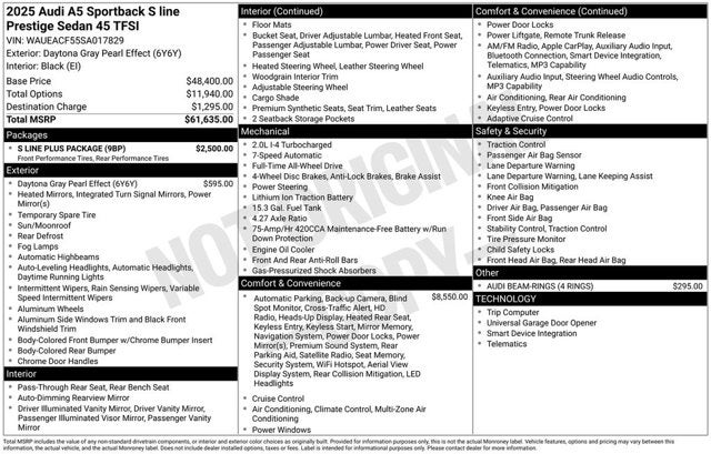 2025 Audi A5 Sportback Daytona Gray Pearl Effect 45 S line Prestige quattro quattro 2.0L 4-Cylinder TFSI 7-Speed Automatic S tronic