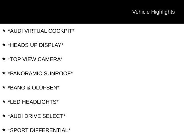 *PREMIUM PLUS PKG*, *QUATTRO*, *AWD*, *NAVIGATION*, *BLACK OPTIC PKG*, *ADAPTIVE CRUISE CONTROL*, *AUDI SIDE ASSIST*, *AUDI ADVANCED KEY*, *AUDI CONNECT*, *APPLE CARPLAY / ANDROID AUTO*, *SATELLITE RADIO*, *SMART PHONE INTERFACE*, *Bluetooth® W/ STREAMING AUDIO*, *HEATED SEATS*, *KEYLESS PUSH START*, *BLIND SPOT MONITOR*, *AUDI VIRTUAL COCKPIT*, *HEADS UP DISPLAY*, *TOP VIEW CAMERA*, *PANORAMIC SUNROOF*, *BANG & OLUFSEN SOUND SYSTEM*, *LED HEADLIGHTS*, *AUDI DRIVE SELECT*, *SPORT DIFFERENTIAL*, SUPER LOW MILES!!!, *STEERING WHEEL CONTROLS*, *HARD TO FIND!*, HEATED STEERING WHEEL, AUDI BEAM S, 7 Additional Digital DRL Signatures, Adaptive Cruise Assist, Animation For Headlights, Anthracite Audi Rings, Bang & Olufsen Sound System with 3D Sound, Black Exterior Door Handle Inlays, Black Exterior Mirror Housings, Black Exterior Trim, Black Optic Package, Dark Chrome Exhaust Tips, Dynamic Interaction Light, Head-Up Display, Headlight Washers, Heated Steering Wheel with Hands-on Detection, LED Interior Lighting Pro Package, Matrix Design LED Headlights, Panoramic Glass with Variable Light Control, Park Assist Plus, Premium Plus Package, Top View Camera System, USB Power Delivery (2x60W Front and 2x100W Rear), Wheels: 20 Multispoke-S Design Bi-Color Finish. CARFAX One-Owner.