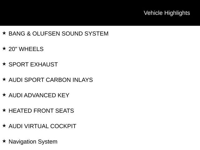 *LOCAL TRADE-IN*, *DYNAMIC PACKAGE*, *BLACK OPTIC PACKAGE*, *RS DESIGN SELECTION INTERIOR - RED, AUDI MMI NAVIGATION, AUDI CONNECT, AUDI SIDE ASSIST, SMARTPHONE INTERFACE, BANG & OLUFSEN SOUND SYSTEM, 20 WHEELS, SPORT EXHAUST, AUDI SPORT CARBON INLAYS, AUDI ADVANCED KEY, HEATED FRONT SEATS, AUDI VIRTUAL COCKPIT, 680W Bang & Olufsen Sound System w/12 Speakers, Audi Connect w/Online Services, Audi MMI Navigation Plus, Audi Side Assist, Audi Smartphone Interface, Black Optic Package, Dynamic Package, High Gloss Black Exterior Mirror Housings, Leather Package, Navigation System, Red Brake Calipers, RS Design Interior Package, RS Design Selection Interior - Red, RS Floor Mats, Sport Exhaust System w/Black Tips, Technology Package, Wheels: 20 Audi Sport 7-Spoke Design Forged, Wheels: 20 Forged Anthracite 7-Spoke Design. CARFAX One-Owner.