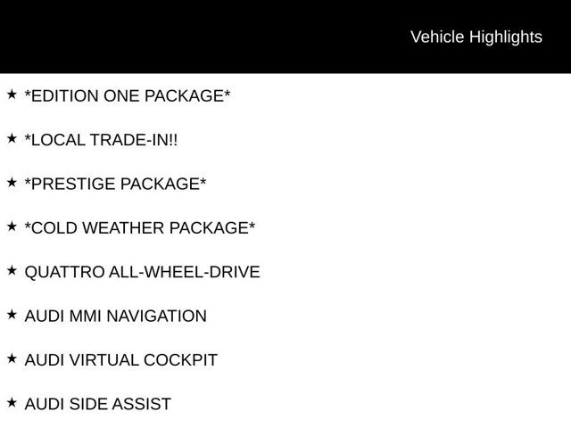 *EDITION ONE PACKAGE*, *LOCAL TRADE-IN!!, *PRESTIGE PACKAGE*, *COLD WEATHER PACKAGE*, QUATTRO ALL-WHEEL-DRIVE, AUDI MMI NAVIGATION, AUDI VIRTUAL COCKPIT, AUDI SIDE ASSIST, BLIND SPOT MONITOR, ADAPTIVE CRUISE CONTROL, AUDI CONNECT, USB, Bluetooth® W/ STREAMING AUDIO, SMARTPHONE INTERFACE, APPLE CARPLAY / ANDROID AUTO, AUDI ADVANCED KEY, POWER TAILGATE W/ HANDSFREE RELEASE, BANG & OLUFSEN 3D SOUND SYSTEM, PANORAMIC SUNROOF, MASSAGING HEATED & VENTILATED FRONT SEATS, BACK UP CAMERA, FULL LEATHER INTERIOR PACKAGE, REAR DOOR SUNSHADES, POWER SOFT-CLOSE DOORS, NIGHT VISION ASSISTANT, HEATED REAR SEATS, HEATED WINSHIELD WASHERS, ADAPTIVE AIR SUSPENSION, Adaptive Windscreen Wipers, Additional High-Voltage Heater, Audi Active Lane Assist w/Emergency Assist, Audi Adaptive Cruise Control Assist, Audi Pre Sense 360, Black Cloth Headliner, Cold Weather Package, Driver Assistance Plus Package, Dual Pane Acoustic Glass for Side Windows, Dynamic Orange Painted Brake Calipers, Edition One Package, Edition One Puddle Lighting, Extended Alu-Optic Exterior Kit, Head-Up Display, Heated & Ventilated Individual Contour Front Seats, Heated Rear Outboard Seats, Ionization & Fragrance Air Quality Package, LED Interior Multi-Color Ambient/Contour Lighting, Manual Sunshades for Rear Doors, Navigation system: Audi MMI Navigation plus with Touch Response, Night Vision Assistant, Passenger Seat Memory, Power Door Closers, Prestige Package, Traffic Sign Recognition, Valcona Semi-Aniline Leather Seat Trim, Volcano Gray Ash Natural Wood Inlays, Wheels: 21 5-Arm-Turbine-Design Bi-Color Black.