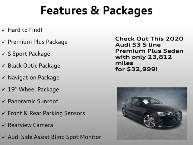 Hard to Find!, Premium Plus Package, S Sport Package, Black Optic Package, Navigation Package, 19 Wheel Package, Panoramic Sunroof, Front & Rear Parking Sensors, Rearview Camera, Audi Side Assist Blind Spot Monitor, Progressive Steering System, Audi Virtual Cockpit, Audi MMI Navigation Plus, Bang & Olufsen Sound System, Apple Carplay & Android Auto, Audi Connect, Bluetooth® w/ Streaming Audio, SiriusXM Radio, Audi Beam - Ring Projection Lights, Audi magnetic ride, S3 2.0T Premium Plus S Line quattro, 4D Sedan, 2.0L 4-Cylinder TFSI, 7-Speed Automatic S tronic, quattro, Mythos Black Metallic, Black w/Rock Gray Stitching w/Leather Seating Surfaces or Fine Nappa Leather Seating Surfaces, Interior Storage Package w/Rear USB Ports.