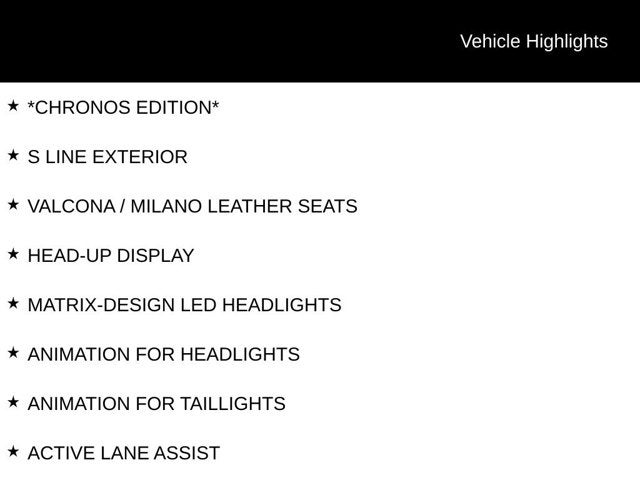 *CHRONOS EDITION*, S LINE EXTERIOR, VALCONA / MILANO LEATHER SEATS, HEAD-UP DISPLAY, MATRIX-DESIGN LED HEADLIGHTS, ANIMATION FOR HEADLIGHTS, ANIMATION FOR TAILLIGHTS, ACTIVE LANE ASSIST, BANG & OLUFSEN 3D SOUND, LED INTERIOR LIGHTING PACKAGE, DYNAMIC ORANGE BRAKE CALIPERS, DUAL-PANE ACOUSTIC GLASS, NAVIGATION, HEATED REAR SEATS, ADAPTIVE CRUISE ASSIST, ILLUMINATED DOOR SILL INLAYS, WIRELESS CHARGING & SIGNAL BOOSTER, MASSAGING SEATS, VENTILATED AND COOLED SEATS, POWER SOFT-CLOSE DOORS, TOP VIEW CAMERA SYSTEM, ADAPTIVE AIR SUSPENSION, VIRTUAL COCKPIT PLUS, SMARTPHONE INTERFACE, AUDI CONNECT PLUS, ADVANCED KEY, PANORAMIC SUNROOF, NATURAL WOOD INLAYS, AUDI PRE SENSE, ABS brakes, Alloy wheels, Compass, Electronic Stability Control, Front dual zone A/C, HEATED DOOR MIRRORS, HEATED FRONT SEATS, Illuminated entry, Low tire pressure warning, Power Liftgate, Rear dual zone A/C, Remote keyless entry, Traction control. CARFAX One-Owner.