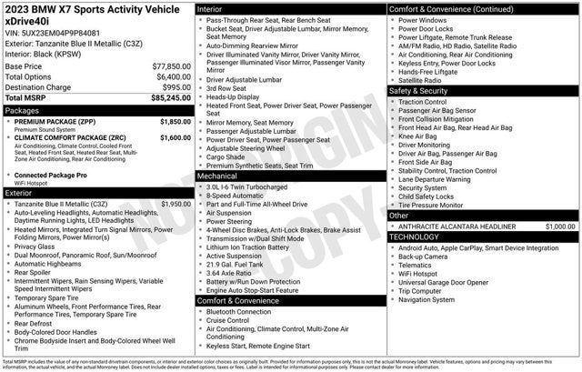 2023 BMW X7 Tanzanite Blue II Metallic xDrive40i AWD 3.0L I6 DOHC 24V 8-Speed Automatic Sport